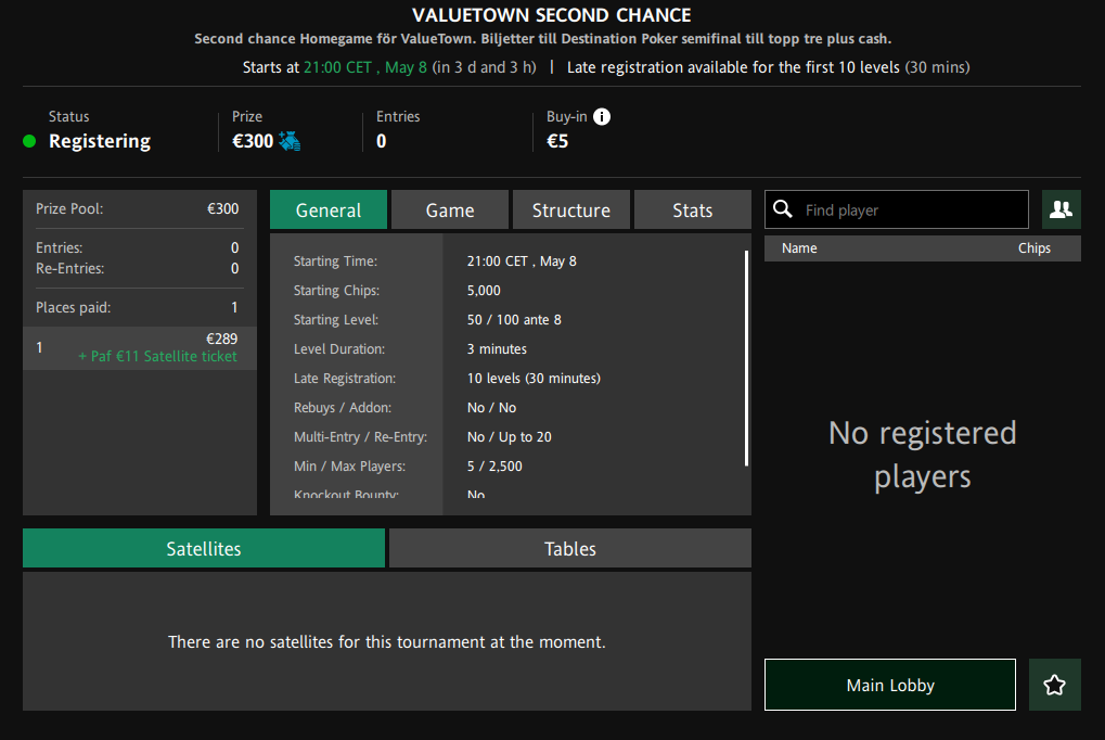 Denna säsong kommer vi utöver den poängbaserade turneringen även köra en Second Chance turnering. Detta är en €5-turnering i hyper-format och har en garanti på €300.  I denna utgör 3x €11-biljetter en del av garantin och dessa kan användas i sub-satellieter till Destination Poker.
